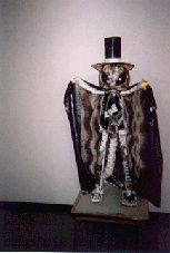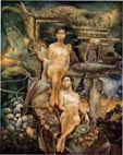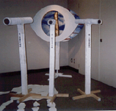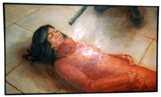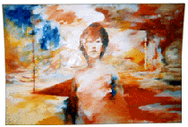2001年12月11日 『高知大学教育学部生涯教育課程芸術文化コース2・3回生 第二回 芸文展』(高知県立美術館)を見に行く。そのなかから2作品を紹介する。 上は土方佐代香(2回生)さんの『half way』。 道半ば、中途半端な、不十分な・・・というような意味だろうか。 写真がカラーではないので不適切だが、赤、白、青の星雲渦巻く混沌とした高密度の宇宙のなかに描かれた自画像(?)は若い土方さんの強い思いが・・・それはたぶん、未来にたいする強い思いだとおもうのだが・・・力強く表出されている。 現在も未来も、もしかしたら混沌とした世界かも知れないが、わたしは叫び声ひとつあげず生きていくんだ。 そんな思いがこの絵からは伝わってくる。土方さんの、混沌への意志の強さ、を感じさせてくれる作品だった。 次は篠原直美(2回生)さんの『有無』。タイトルの意味はよく理解できないが、赤っぽい服を着た女が横たわっている。寝ているのか、気を失っているのか、死んでいるのか。 上部には軍靴らしきものが描かれていて画面に緊張感を与えている。これは軍靴なのか、それとも模造品なのか。軍靴だとしたらこの軍靴の持ち主は誰なのか。その答によってこの絵はさまざまな表情を見せることになる。 それと同時に、この女が死んでいると仮定したとき、その死は肉体的な死なのか、精神的な死なのか。 いや、そもそも女は死んでいるのか。もしかしたら、これから訪れる快楽を待ち望んでいる束の間の静寂のひとときかも知れない。それらはすべて、軍靴の持ち主によって決定されてしまうような気が、ぼくにはしている。「他者とは誰か?」そんな声がかすかに聞こえてくる作品だった。 国吉晶子(1979年生)展(ギャラリー・グラフィティ)の油彩も美しかった。 大きなキャンバスの油彩画が五点。「雪山とスキーヤー」と題する作品が二点と、「氷面」と題する作品が一点、「家路」と題する作品が二点(上がその一点)。 『南国育ちのせいか「冬」や「厳しさ」にあこがれます』ということで、どの作品も白が印象的に使われていた。 美しい油彩画はたくさんある。キャンバスの中に整然とした美しさを保ち、作者の感性が過不足なく表現されている作品、それ以下でもなくそれ以上でもなくあるがままの美しさを保っている作品、作者の感性のなかから脱皮できない「美しさ」、それらの「美しさ」もまた美しい。「美しさ」のひとつのあり方である。 ただ、そういう、誰もが見極めて、落ち着くことができる、あるいは決して罵られることのないという99パーセントの「美しさ」が、作者の表現者としての切迫感を十二分に表しているかというと、そうではない。確かに安定した「美しさ」は観客の心にある種の軟らかさを届かせるだろう。「いい絵に出会った」という充足感に浸ることができるだろう。それはそれでいい。誰も皆「絵を見る」という充足感を求めてギャラリーに足を運ぶのだから。観客の鑑賞眼の中で「美しさ」を放っている油彩を否定するものではない。 初めて見た国吉さんの油彩は、そこ(ギャラリーの壁面)に収まりきらない「美しさ」があった。白の美しさが印象的だったが、その美しさが、キャンバスをはみ出さずにはいられない力を持っているというような感じを受けた。キャンバスをはみ出た作者の思いは壁面に転移し、壁面にも収まりきらない感性は観客の身体にペインティングされる、という力強さを持っていた。 国吉さん自身は落ち着いた女性だが、その作品は、安定しているように見えて、その場に定着し安住し、その選んだ形に安住するといった保守的な道を選ばない、と敢然として決意しているような雰囲気を醸し出していた。 そこにある「美しさ」が「美しさ」をはみ出て自在さを獲得し、その結果「美しさ」が毀れたとしてもそれを後悔することはない、という気迫ある油彩だった。 先の木下さんの腐食の美しさもそうだが、「そのもの」の形が安定することを求めるのは愚かなことだと思う。常に「そのもの」の未知の力を知るところに「美しさ」があるのだと思う。 そう書いているぼくも相当保守的に、今ある人生を取りこぼすことのないような生き方を平然としている。他者の目の中で生きていこうとしているやましいところがちらほらしている。国吉さんの油彩を見ながら自戒していた。 この世に美しいものはたくさんある。……海に落ちる夕陽。稜線を区切る雲。雨上がりの空気の色。風にざわめく竹林の音……。清潔で健康的な「美しさ」の集積、と言っていいだろう。そういう「美しさ」に魅かれる日々と、「腐食の美しさ」に魅かれる瞬間がある。 この世に存在するものは、不動なもの、不変なものなど何ひとつなく、命あるもの、命ないもの、すべて、いま在る形をうしない、変質を余儀なくされる。……朽ちた樹木。土に還る蝉。胴体を朽ち果てらせたカマキリの足。緑青の輝き……。 腐食し、朽ち果て、自らの姿を喪失する過程、そんな