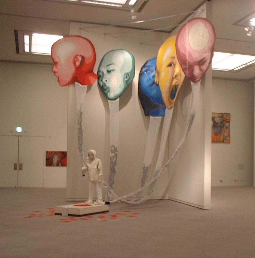 7月17日、国吉晶子展(ギャラリーファウスト)を見る。 「花」「ice」「border」と題した油彩が9点。 この若い人(1979年生)の油彩を昨年初めて見せていただいたとき、その迫力にびっくりした記憶がある。 その初めての記憶をぼくは次のように書き残した。 「そこにある“美しさ” が“美しさ” をはみ出て、自在さを獲得し、その結果“美しさ”が毀れたとしてもそれを後悔することはない、という気迫ある油彩だった」 今回の印象も同じだった。気迫ある美しさが会場に張りつめていた。 いい展覧会というものは、一言も声が出ないものだ。作者の思いの襞に耳を貸そうとすると、声など出ようはずもない。作者の気迫に圧倒されれば、声など出ようはずもない。 ただた作品の前に立ちすくみ、作品の悲鳴と、悦楽の声を聞き留め、自らの生の貧しさを思い知ることでしかない。 今回も前回同様、白の美しさが目立っていた。 ギャラリー全体に展開されていたのは、「人の心のborder」が、「人の心の氷点」が、国吉さんの手で明らかにされた瞬間を追体験することだが、ほんとうはそのむこうで無防備的に展開されはじめる「新たな、人の心のborderや氷点」が、観客に転移していく過程が用意されているのだが、そのことの悲劇性に気づく者は少ない。気づかれなかった「新たな人の心のborderや氷点」は整然とした秩序を持ち得ないまま、誰かによって、破棄される。 ひと月にどれほどの展覧会を見に行くのか記録を取ったことがないのでわからないが、それらの展覧会のほとんどが、“自前の美しさ”をあっけらかんと展示しているだけで、壁面に収まりきらない気迫が迫ってくることはない。 もっとも、“気迫”を求めるのはぼくの勝手で、美術に関わっている人すべてが自らを壊しても悔いない闘いを日夜繰り広げているわけでもないだろうし、“自前の美しさ”すら漂わせていない作品もあるのだから、“自前の美しさ”を良しとしなければならないだろうし、ぼくにしたって、自らの生死を賭けた作品を毎回残しているわけでもない。日々安穏と、予定調和を良しとした愚かさを繰り返しているだけなのだから。 たぶん、国吉さんだって、制作している作品すべてが、自らの心と肉体を賭けた作品だといっているわけでもないだろうが、国吉さんの作品はいつも(といっても、まだ2回目だが)、ぼくの目には、“美しさ”が“美しさ”として安定することは愚かなことだ、ということを思い知らせてくれる気迫が漂っている。 それらはたぶん、そこにあるだけの美しさ、を国吉さん自身が潔しとしていない結果だろうとおもう。それは、自分の存在をも潔しとしていないことに繋がっている、とおもうのだが、国吉さんはどうおもっているのだろう。 高知市文化プラザ「かるぽーと」『OVERDRIVE EXHIBITION─新しい世代による造形表現─』で石井葉子さんの「アナタとワタシのニンシキソウチ 2003年度型・ヨ・」と題するインスタレーションを見てきた。 石井さんの作品は幾つか見ているのだが、ぼくが彼女の作品に惹かれるのは、自分の存在を怖れていない(ほんとうは怖れているのかもしれないが)、と思わせるような自己の提出の仕方だ。今度の作品も、堂々としたものだ。存在感で他を圧倒していた。 私事で申し訳ないが、ぼくは10代の後半から20代の前半にかけて『自分自身のための広告』とか『個人的なるもの』といった誌名の個人雑誌を精力的に発行していた。その誌名の付け方には圧倒的な自我だけがあった。 たとえ、詩は「乖離する自我」によって書かれ、「私のなかの他者」によって自立する、ものだということを認識しつつも、ひたすら、圧倒的な自我が世界を認識し凌駕する欲望、に身を焦がしていた。。 石井さんがそうだ、とは言わないし、また、石井さんのことを爪の先ほどにも知らないのだが、石井さんの作品に接するたび、圧倒的な「石井葉子」に出会ってしまう。その出会い方は、年老いたぼくの、世界への婉曲した方法論を無言のうちに批判している、とさえ思える。しかし、いまさら、直截的な自己の放出も恥ずかしいので、その批判は黙って受けようとは思っているが、堂々とした石井さんの作品の前に立つと、その力業(ちからわざ)にただただ感心するしかない。そういう意味では、石井さんの作品の前では、こしゃくな思考などなにほどのものだろう。圧倒的な存在感の前に観客が曝すのは、隠匿した恥部だけではないだろうか、と父親の世代であるぼくはついオタオタしてしまうだけだ。 さて、作品だが、石井さんとおぼしき等身大の人物が宇宙服のようなものを身に付けて立っている。その前に立つと、手に持ったランプに灯りがともるというトリックが施されているが、それはオマケみたいなものだ。 背中には5人の他者(あるいは自我)を背負っている。 他者(あるいは自我)から伸びた首はその先端で手になっており、その手にはハサミやナイフが握られ、石井さんの脚や背中に食